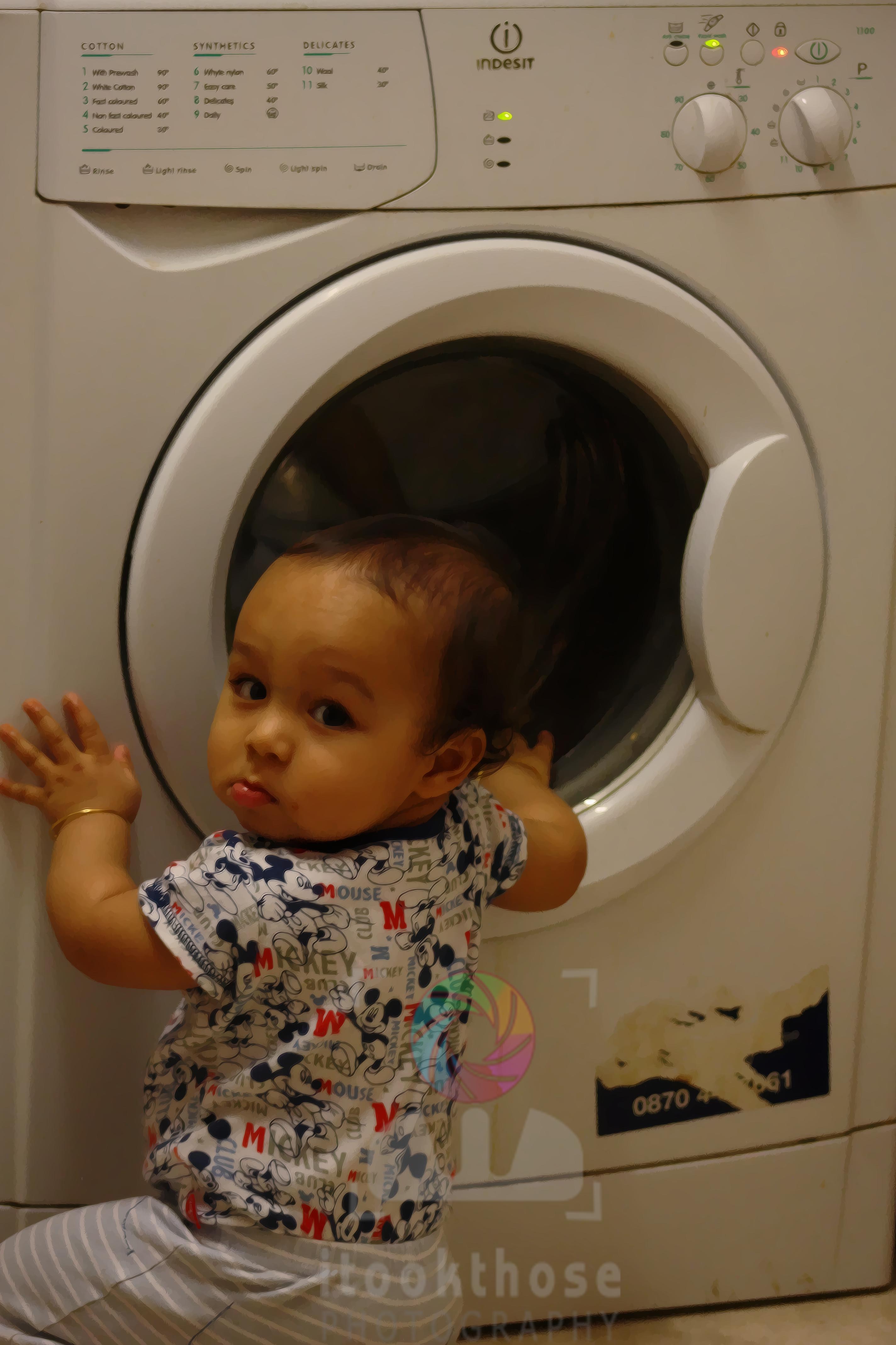 At this point, I’m sure Pa is going to give me one tight whack. But he just stands there wrinkling his nose up in disgust. That’s when it hits me that he must have got a whiff of what was in my diaper. He gingerly picks me up and takes me into the loo, where he washes off my poo (Hey, that rhymed!). But not before I manage to get hold of the soap dispenser, a few tooth brushes and a tube of paste and throw it on the ground. After a quick (but rather vigorous) body wash, he gets me all dressed up again. I follow Pa as he rushes off to the kitchen balcony and puts my clothes into a rather large machine, throws in some white powder and hastily presses some buttons. Oblivious of my presence, he gets back in to the kitchen and closes the door after him. I do not make a sound and watch him disappear from view. I wait for a few minutes by the door to check if he notices that I’m missing. But if I know him well, he’s probably chatting away with those lovely ladies and the handsome cartoon man. Now, even though I am only 22 months old, I believe in making the most of the time I have. So I go exploring this very tiny balcony. I notice there are three sets of buckets, one of them more brighter than the others. I open the lid and peer inside. Since the area is quite dimly lit, I end up putting my hand into the bucket in an attempt to discover its mysterious contents. As my fingers grasp hold of something slimy, I hear the balcony door opening. I turn around to see Pa waving his hand at me and muttering something which sounds like “Why…something….I…something ..you. something…bath…something…” I smile at him again as he picks me up and washes my hands with soap.